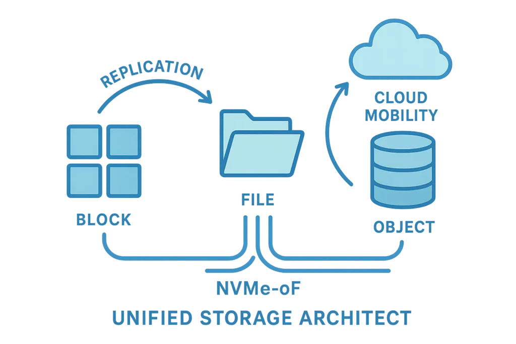 Front-end NVMe/FC and NVMe/TCP; optional NFS over RDMA for GPU/AI pipelines; consistent sub-millisecond latency.